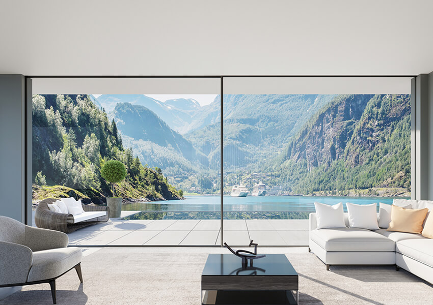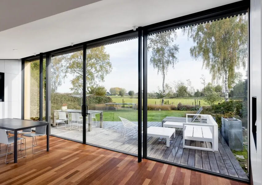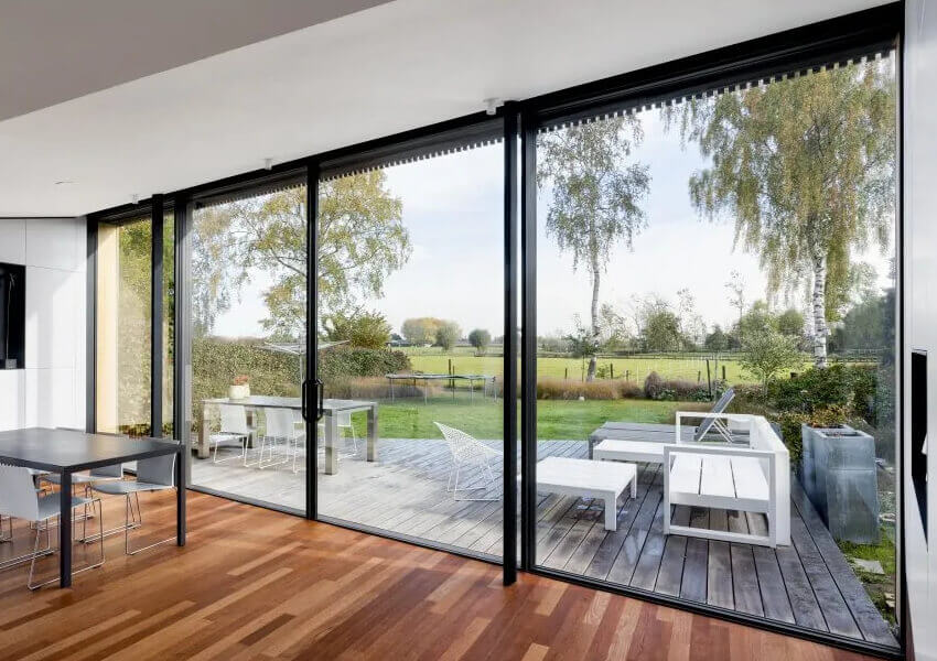 - Bu tamamen şeffaf ve ulaşılabilir sürme sistemi, evin içini kesintisiz bir şekilde dışarıya taşır.